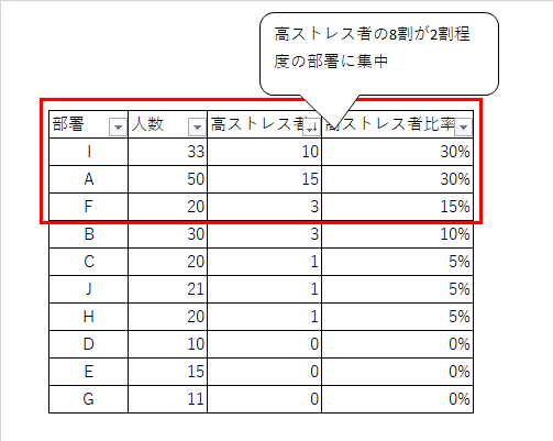- 集団分析を行えば、高ストレス者の約8割が2割の部署に偏っていることが多く見えてきます。