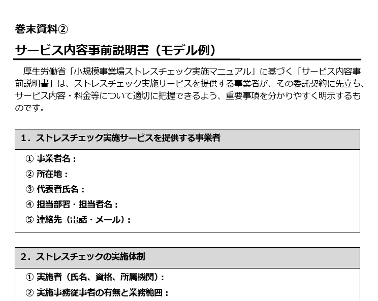 それに伴って委託先のサービス内容や態勢の確認を求める規定が追加されています。具体的には「事業者は、ストレスチェックの委託先の選定に当たっては、事前に外部機関から「サービス内容事前説明書」を作成・提出してもらい、その内容を確認します。事業者は、ストレスチェックの委託先の選定に当たっては、事前に外部機関から「サービス内容事前説明書」を作成・提出してもらい、その内容を確認します。」といった外部委託先にサービス内容事前説明書の提出を求める記述が追加されています。このサービス内容事前説明書は「小規模事業場ストレスチェック実施マニュアル」の巻末資料の1つとしてモデル例が示されていますが、現行「労働安全衛生法に基づく ストレスチェック制度 実施マニュアル」に存在する外部委託先に対するチェックリストよりもかなり詳しい内容となっていることが特徴です。