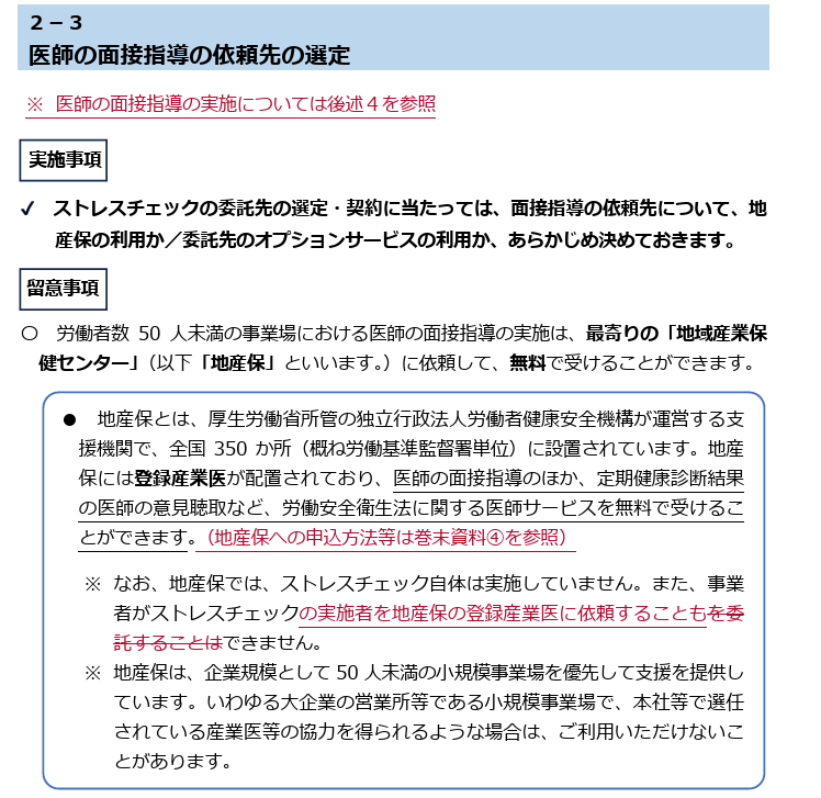 50名以上の事業場規模を想定した「労働安全衛生法に基づく ストレスチェック制度 実施マニュアル」では産業医が存在するので産業医への委託が原則とされていたところ、「小規模事業場ストレスチェック実施マニュアル」が想定する50名未満事業場では医師の面接指導は地域産業保健センターが無料で実施することが出来るとされています。