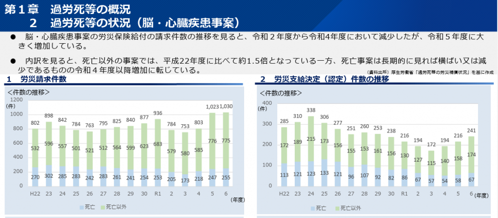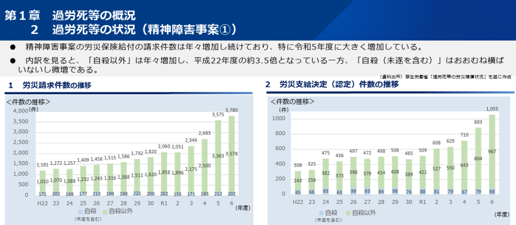まず、「過労死等の状況(脳・心臓疾患事案)」をみると、労災請求件数および支給決定件数は令和2年度から令和4年度にかけて減少傾向にありました。しかし、令和5年度には大きく増加しています。これは、新型コロナウイルス感染症の影響により経済活動が一時的に停滞し業務負荷が軽減したものの、その後の経済回復によって再び業務量が増え、労働者の負担が高まったことが背景にあると考えられます。