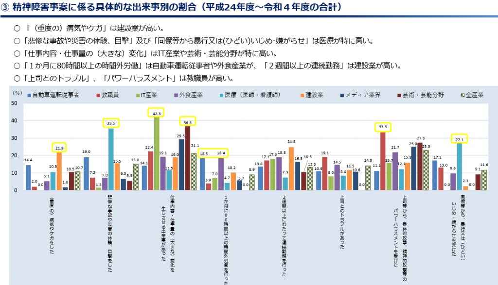 建設業では「重度の病気やケガ」に関連するケースが多く、医療業界では「悲惨な事故・災害の体験や目撃」や「同僚からの暴行・いじめ」に関する割合が高い傾向にあります。IT産業や芸術・芸能分野では「仕事内容・仕事量の大きな変化」が多く、外食産業や自動車運転従事者では「月80時間以上の時間外労働」、建設業では「2週間以上の連続勤務」が特徴的です。さらに、教職員では「上司とのトラブル」や「パワーハラスメント」が精神障害の主な要因となっています。
